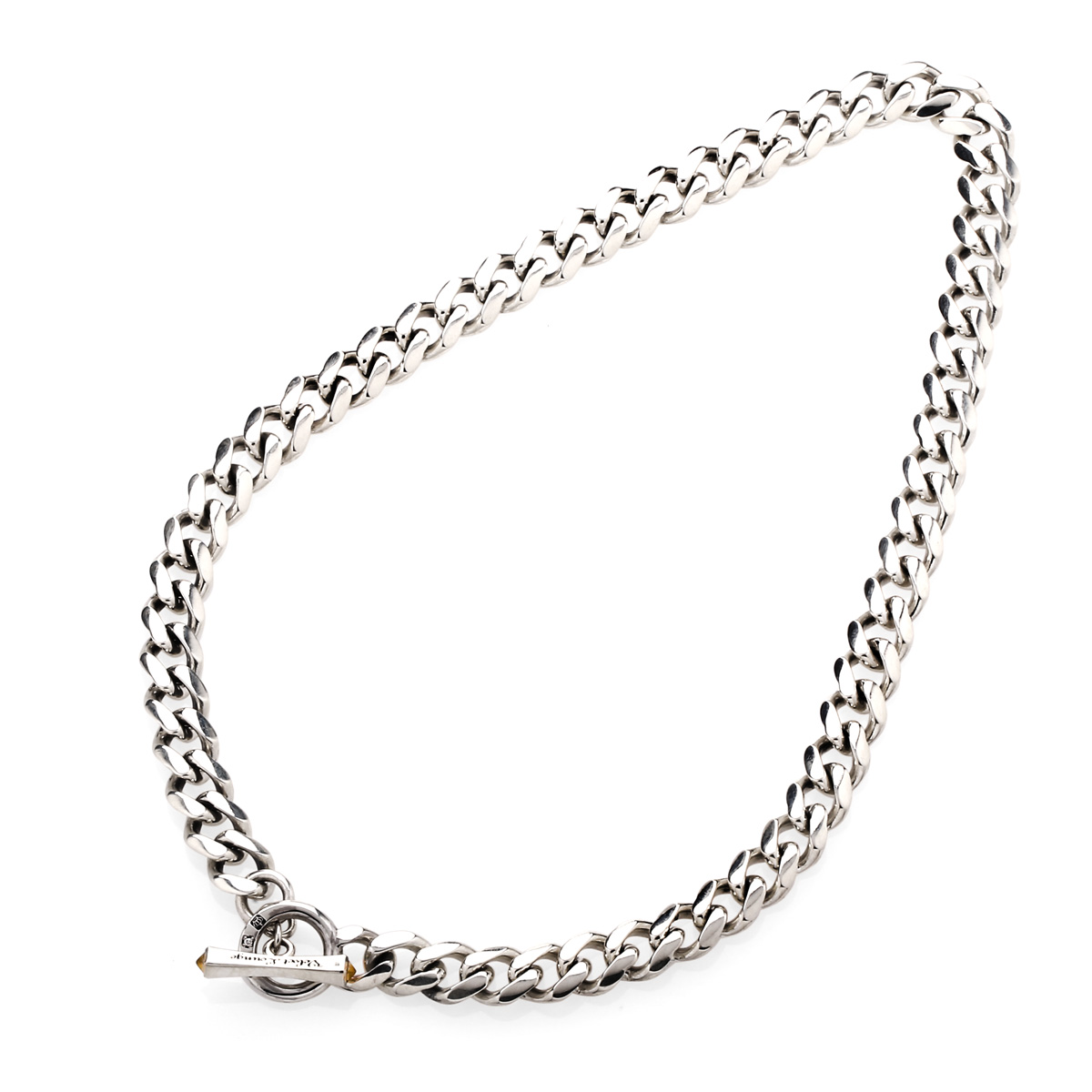 昨年リリースした人気のチェーンブレスレットをネックレスにアレンジしています。ご希望に応じて長さ変更のカスタムも可能です。 カジュアルスタイルをMIXしたコーディネートにオススメです。 |